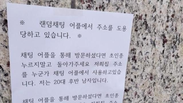 누군가 자기 주소를 랜덤채팅 앱에 도용해 올렸다며 피해를 호소하는 글이 올라왔다. 최근 누리꾼 A씨는 “방금 집 가면서 엘리베이터에 붙은 소름 …
