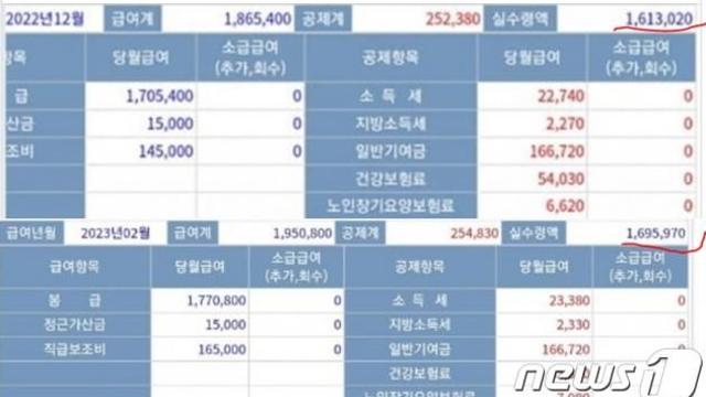 해군 하사 1호봉 월급 명세서. 월 200만원에 못미치며 실 수령액은 170만원이 안된다. 새해들어 월급이 올랐지만 170만원에 못 미치는 돈을…
