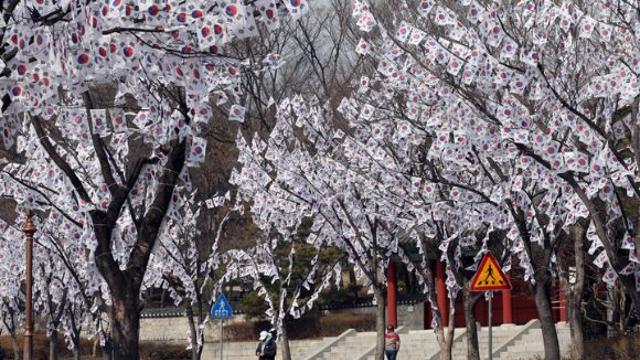 한 트위터 이용자는 지난 3일 “벚꽃 핀 줄 알고 너무 기뻐서 달려갔는데 태극기였다”며 가로수에 태극기가 가득 달린 효창공원 사진 두 장을 공유…