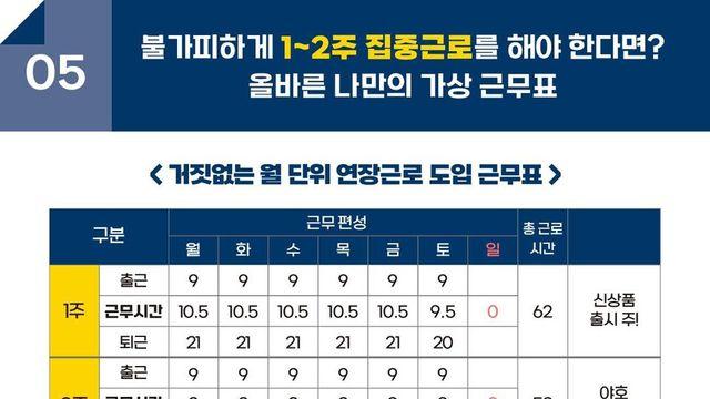 고용노동부가 제시한 ‘거짓없는 월 단위 연장근로 도입 근무표’. 【투데이신문 】 고용노동부가 근로시간 개편안에 대한 오해를 풀겠다며 공개한 가상…